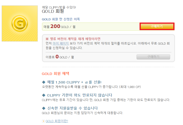 골드 회원을 계속 유지하면 클리피 보너스를 얻을 수 있습니다. (매월 1,500 CLIPPY + α를 선물)