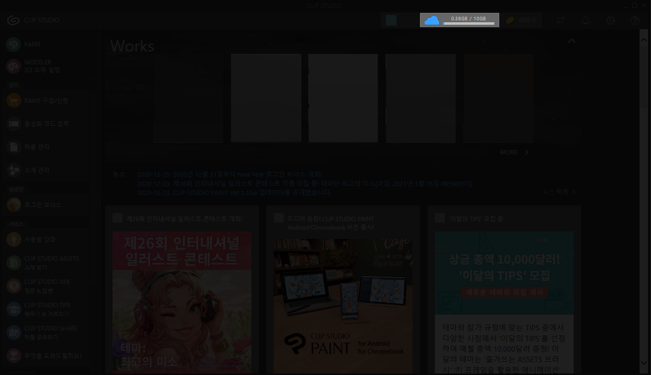 1. 클립스튜디오 런쳐를 실행 후 오른쪽 상단의 클라우드 모양을 눌러줍니다.