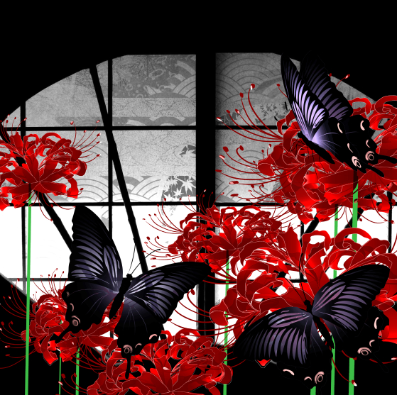 소재들은 등나무꽃, 죽도화,나비, 칼집, 오니가면 정도 입니다.