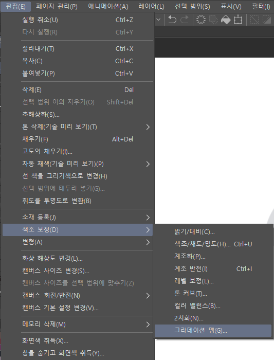 1. 그라데이션이 아닌 [편집] - [색조보정] - [그라데이션 맵]에 갑니다.